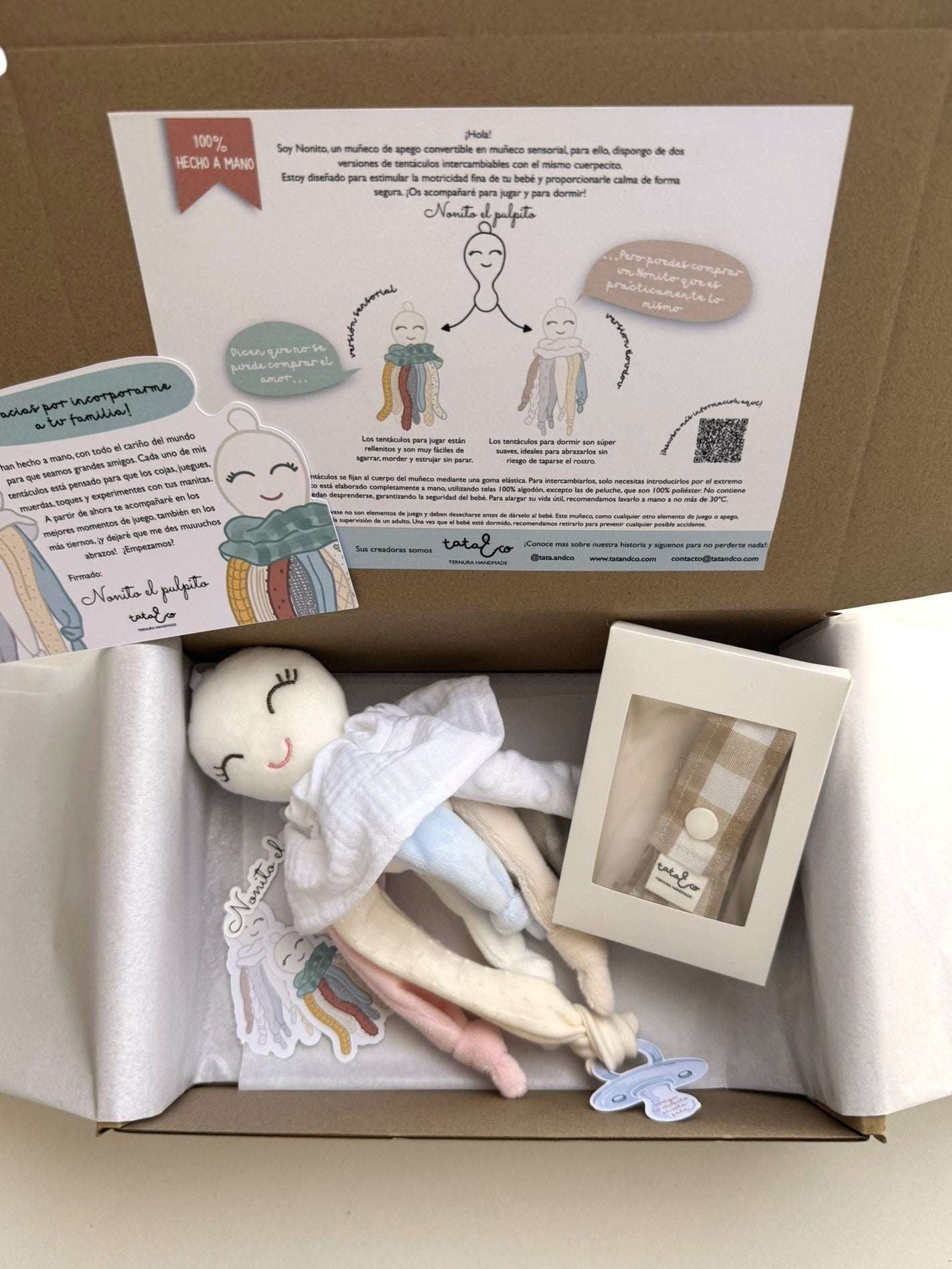 🐙Nonito doudou diseñado para evitar que el bebé se tape la carita con grandes trozos de tela y calmarlo con la calidez de sus tentáculos que acariciará y agarrará con sus manitas mientras se queda dormido.